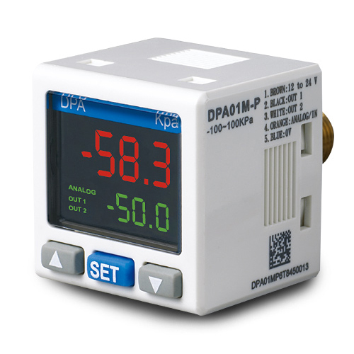 DPA系列的标准型压力传感器,主要是侦测气体正压与负压的压力值,DPA可以对应六种全球泛用的标准气体压力单位,以及拥有大型LED,绿、红、橙三色显示功能,让用户可以依据需求,去设定相对应的颜色,并提供多样化的输出控制模式,像是NPN、PNP、模拟电压、电流输出讯号,也可以透过参数快速复制功能,将主机内的参数直接复制至其他DPA主机上,节省重复的参数设定所需时间,而且为了响应环保节能需求,DPA也提供省能源模式,可以节省20%以上的电力消耗,并且透过安全操控模式,避免现场人员因为不小心设定到相关参数,而影响到现场设备动作以及生产,所以透过DPA如此强大的功能,就可以广泛的应用于像是机械加工产业、食品包装产业、电子零组件产业、太阳能产业、半导体产业、自动化装配等各式各样产业上。