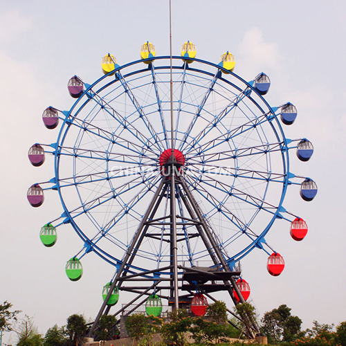 本设备旋转大轮安装在巨大的立柱上而组成的,远看像是五彩缤纷的巨大车轮滚滚向前。座舱造型美观,为铝合金结构,好似一颗颗晶莹的珍珠鑲钳在大转轮的外缘上,每只吊厢随大转轮的转动而慢慢移动,运行速度约0.22米/秒。由于速度缓慢,乘客可以随上随下,十分方便。乘客坐在吊厢内,随着大转轮的转动逐渐升高,隔窗远眺,视野逐渐开阔,可尽情地观赏城市美景,大地风光,秀丽山川和美丽富饶的田野。