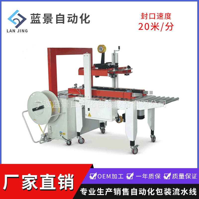 打包封箱机结合自动折盖封箱机及全自动捆包机组成的包装流水线系统。采用台面滚筒无动力,针对顾客封箱及捆包双机一体设计,使封箱、捆包作业一体化。适用于广泛用于食品、医药、日化、等行业,适用于纸箱打包、纸张打包、药箱打包等各种大小货物的打包捆扎。