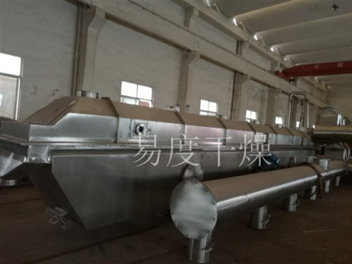 物料自进料进口进入机内,在振动力作用下,物料沿水平面流化床抛掷,向前连续运动,热风向上穿过流化床同湿物料换热后,湿空气经旋风分离器除尘后由排风1:3排出.干燥物料由排料进口排出。
